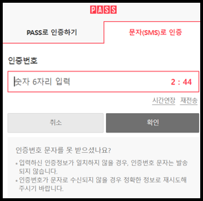 문자메시지 인증의 경우 인증번호를 입력하고 확인합니다.