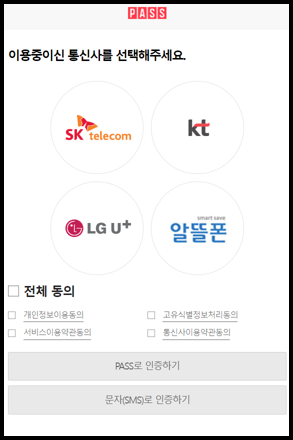 5. (휴대폰인증)을 선택한 경우 이용중인 통신사를 선택하고 하단에 전체동의를 눌러주시기 바랍니다.  PASS 또는 문자(SMS)중 하나로 인증방식을 선택해 주시기 바랍니다. PASS로 인증할 경우에는 PASS 어플이 사용하시는 스마트폰에 설치되어 있어야 합니다. 요즘 본인인증에 PASS 어플이 쓰이고 있습니다. 아직 PASS 어플을 설치하지 않으신 분들은 이번기회에 설치하시면 앞으로 본인인증을 편리하게 하실 수 있을 것입니다.