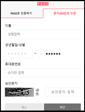 6. PASS 본인 인증의 경우 어플에서 비밀 번호를 눌러주시기 바랍니다. 문자(SMS) 인증의 경우 이름, 생년월일 및 성별정보, 휴대폰번호를 입력해주시고 하단의 보안문자까지 정확하게 입력합니다. 휴대폰 문자로 받은 인증번호 숫자 6자리를 입력하고 확인해 주시기 바랍니다.